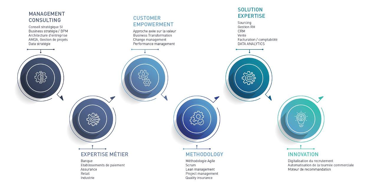 La capitalisation sur notre retour d’expérience (know-how) de projets SI et Organisationnel pour conseiller nos clients et apporter de l’innovation sur les services offerts