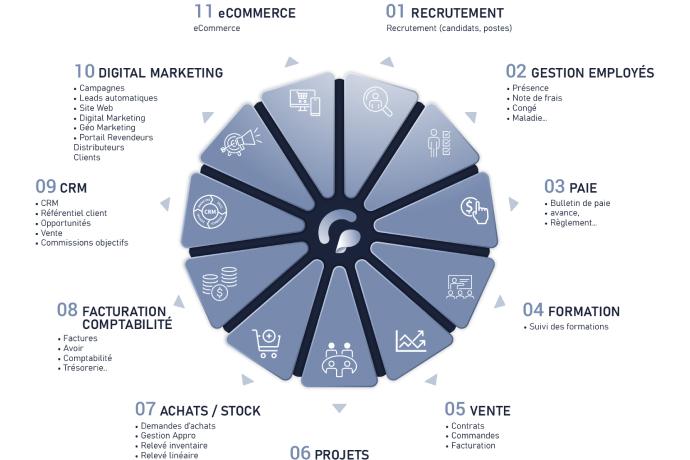 ERP : Gestion du recrutement, Gestion des ressources humaines, Achat, Vente, Gestion de stocks, Inventaire, Facturation, Comptabilité…